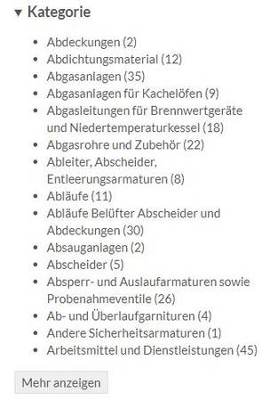Und damit Sie wirklich finden, was Sie suchen, gibt es umfangreiche Filtermöglichkeiten. Die Filter nach Produktkategorien sind alphabetisch geordnet, ein Klick auf "Mehr anzeigen" öffnet die gesamte Liste.  Hier können Sie nach mehr als 200 verschiedenen Produktkategorien selektieren und so die Hersteller von entsprechenden Geräten und Teilen  finden. Diese Filter lassen sich auch kombinieren bzw. durch einen Klick auf den ausgewählten Eintrag wieder deaktivieren.