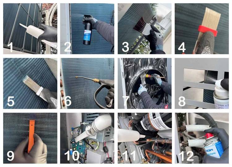 Zudem gibt es einen Flossenkamm, um die Lamellen zu glätten und einen optimalen Luftstrom aufrechtzuhalten sowie ein universelles Lamellenkammsystem zur Glättung und Richtung beschädigter Lamellen. Mit dem speziellen Kältespray lässt sich der Fühler der Außeneinheit bis zu -20 °C kontrollieren. Die Wartung wird jährlich empfohlen, entsprechende Aufkleber liegen bei.