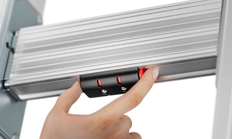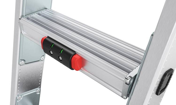 Eingestellt wird dieses Produktfeature denkbar einfach per Fußpedal; der Querbalken mit großflächigen Tatzenfüßen sorgt zudem für eine hohe Standfestigkeit. Eine doppelt verwulstete Holm-Sprossen-Verbindung macht die Leitern extrem stabil und belastbar bis 150 Kilogramm. Dank der Rasthaken mit Transportsicherung lassen sich die beiden Modelle problemlos befördern und verstauen.