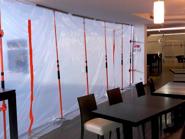 Mithilfe des Wandsystems Heywall werden die Teile des Raumes abgeschottet, in denen die Sanierungen, Renovierungen oder Abrissarbeiten stattfinden. Das flexible Modul-System beinhaltet ausziehbare Systemstangen aus Aluminium bis zu 3,60 Meter Höhe, die zusammen mit einer Folie eine staubdichte Absperrung schaffen. In wenigen Minuten ist die Heywall auf- und abgebaut – ohne Werkzeug und Leiter. Abdecken und Abkleben von Türen, Fenstern und Möbeln entfällt. Die Staubschutzwand kann sowohl als Raumteiler, in L- bzw. U-Form oder als Polygon aufgestellt werden, alle Winkel sind möglich.