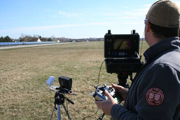 Für die Übertragung des Live-Streams der Wärmebildkamera plante Mario Hambsch ursprünglich eine WLAN-Verbindung zu nutzen, denn die FLIR T620 kann mit einem Tablet-PC über WLAN ferngesteuert werden. In der Praxis erwies sich die WLAN-Option für Flüge im Freien allerdings nicht als ideal. "Eine WLAN-Verbindung reicht oft nur 40-80m weit, da ist unsere Drohne schnell weiter entfernt", weiß Mario Hambsch heute zu berichten. "Und versuchen Sie mal, draußen bei hellem Sonnenschein auf einem energiesparenden iPad-Bildschirm etwas zu erkennen." Daher entwickelte er gemeinsam mit dem Informationstechniker eine alternative Lösung, bei der die Kamera über die Funksteuerung der Drohne noch aus bis zu 2 km Entfernung bedient werden kann.