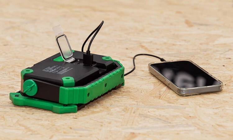 Der Strahler benötigt kein spezielles Ladegerät, er lässt sich einfach über einen Micro-USB-Anschluss aufladen. Die vierteilige LED-Kapazitätsanzeige gibt jederzeit Auskunft über den Ladestand des Akkus. Eine Besonderheit ist die Möglichkeit, den Arbeitsstrahler bei Notwendigkeit auch als Powerbank nutzen zu können. Über einen Micro-USB-Anschluss können ein Smartphone und andere mobile Geräte mit Strom versorgt und geladen werden.