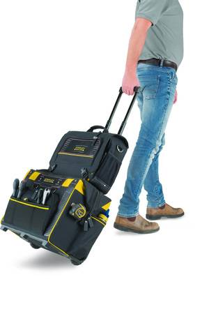 Der neue Werkzeugkoffer FMST1-80148 ist aus dem gleichen strapazierfähigen Nylon hergestellt wie die Stanley Fatmax Laptoptasche. Der Rollkoffer hat oben eine große Öffnung, damit sich das Werkzeug schnell finden lässt; zudem sorgen in seinem Innern ein verstellbarer Teiler und viele Innentaschen für Ordnung. Durch seinen Teleskopgriff und seine leichtgängigen Rollen lässt er sich leicht transportieren. So sind alle wichtigen Werkzeuge immer dabei - ob Hammer, Zangen, Akkuschrauber etc. oder eben das Notebook. Die Laptoptasche hat die Maße 44 x 30,5 x 12,5 cm (LxBxH) und passt optimal auf den etwas breiteren Werkzeugkoffer, der mit 46 x 38 x 27 cm (LxBxH) eine stabile Auflagefläche bietet. Beides kann als Einheit bequem auf den leichtgängigen Rollen gezogen werden.