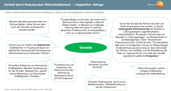 Thermografie bietet zu den naheliegenden Einsatzbereichen im Tagesgeschäft viele Möglichkeiten für Zusatzgeschäfte. Gerade der Gebäudebestand, aber auch mancher Neubau weist häufig unsichtbare Mängel auf. Diese können nach Rücksprache mit dem Kunden selbst behoben oder an qualifizierte Partner übergeben werden. Die Zeit- und Kosteneffizienz durch schnelle, berührungslose und zerstörungsfreie Inspektion verbessert zudem die Energieeffizienz und reduziert Heiz- und Kühlkosten des Kunden.