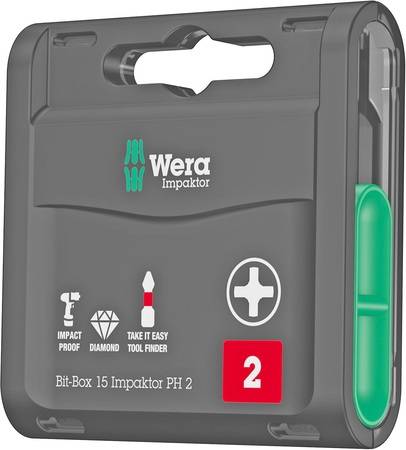 Im Programm sind u. a. drei Boxen mit Impaktor-Bits in den Profilen Philips, Pozidriv oder Torx. Zusätzlich befinden sich auf der Spitze der Impaktor-Bits kleine Diamantpartikel. Sie reduzieren die sogenannten Cam-Out-Kräfte, die zum Herausrutschen des Bits aus der Schraube führen. Dies verringert den benötigten Anpressdruck. Weitere vier Boxen enthalten BiTorsion-Bits mit jeweils unterschiedlichen Profilen. Bei diesen Bits beugt eine spezielle Torsionszone dem vorzeitigen Verschleiß vor. Diese Bits stehen wahlweise als zähharte Ausführung oder als harte Version für Schraubarbeiten in Holz zur Verfügung. | www.wera.de