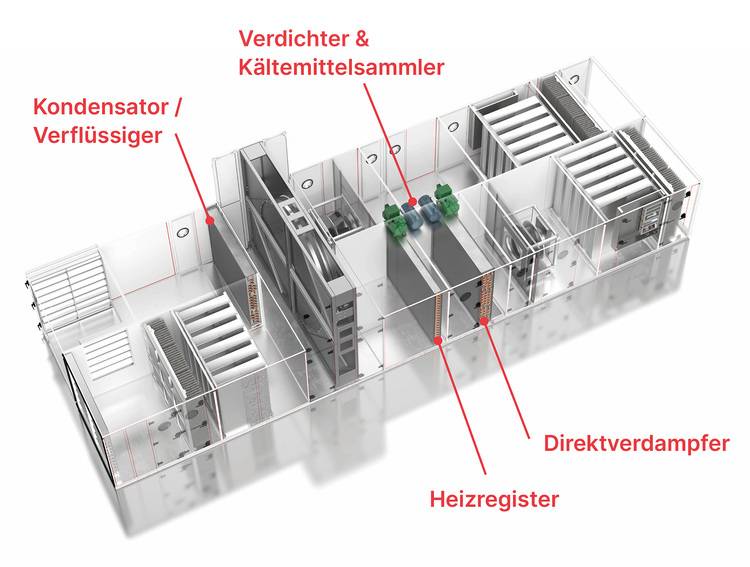 Ein integrierter Kälteerzeuger mit externem Kondensator zur Kühlung der Zuluft.