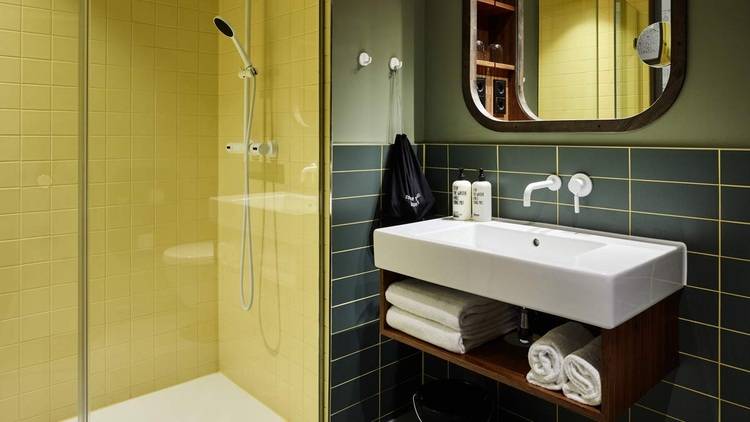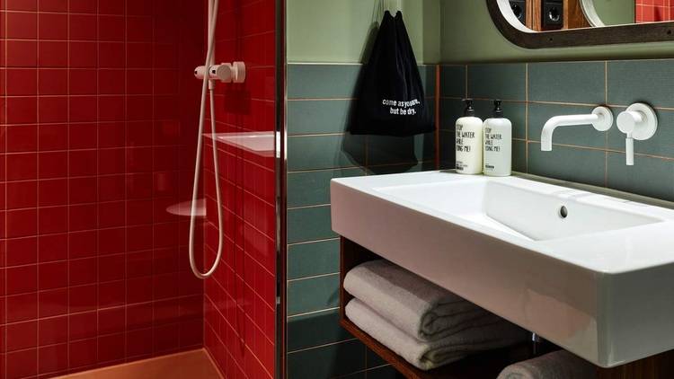 Die 170 Bäder des 25hours Hotel HafenCity wurden umgebaut und auch farblich noch stärker in die hotelübergreifende maritime Erzählung eingebunden.