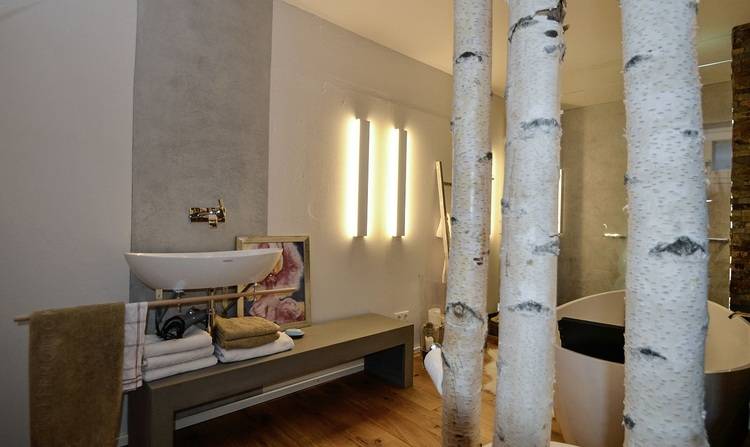 Neben der Badewanne verschwindet das Dusch-WC hinter drei Birkenstämmen, die zur Tür hin aufgestellt werden. Sie erfüllen einen schönen, dekorativen Zweck, verstärken den Bezug zur Natur, spenden ausreichend Intimsphäre und sind der perfekte Ort, um den recht einfachen, aber sehr praktischen Papierrollenhalter anzubringen. Die durchgehende Designplatte hinter dem WC ermöglicht die Montage auf der unebenen Wandfläche.