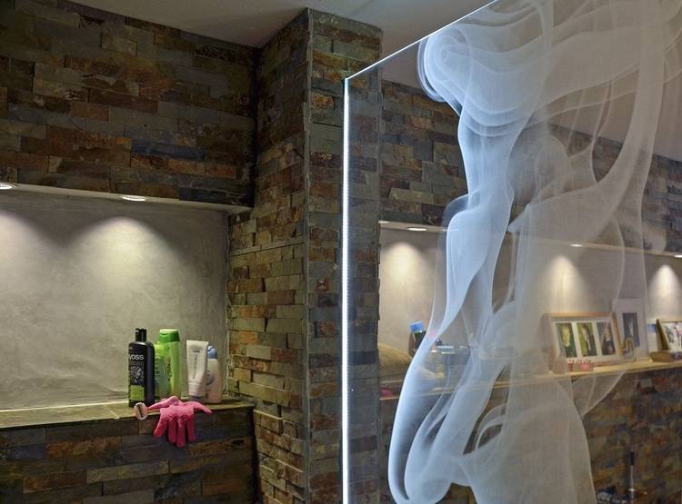 Die rechte Raumseite wird komplett mit einer Vorwand versehen, um die notwendigen technischen Dinge unterbringen zu können. Über die gesamte Breite ist sie mit einer großzügigen Nische unterteilt, die als Shampoo-Nische, Dekoboard und Lichtelement zugleich dient. Nur als Abtrennung zur Duschzone hin ist sie in Sitztiefe mit einer deckenhohen Säule unterteilt, die die beleuchtete Glasscheibe mit Lasergravur einfasst.