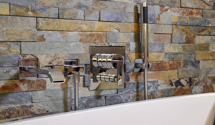 Die starke 3D-Optik der Wandoberfläche macht es notwendig, die Schiefersteine in Form der Armaturenblenden auszuklinken – eine Arbeit, die gekonnte Handwerkerleistung voraussetzt.