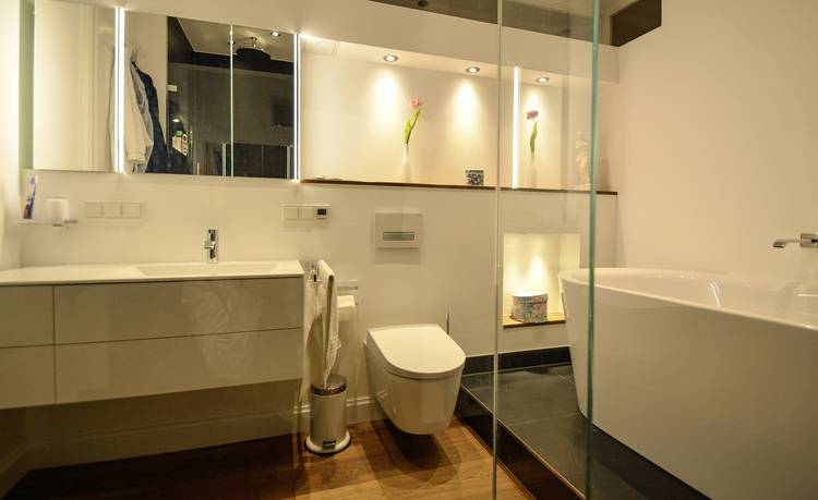 Auch in einem Raum mit nur 7,5 m² lässt sich der Wunsch nach einer freistehenden Wanne erfüllen. Möchte man eine freistehende Badewanne an die Wand stellen, ist darauf zu achten, dass seitlich noch etwas Platz bleibt, um den Wischer hinter der Wanne entlangführen zu können. Sollte das nicht machbar sein, so ist dann eher zu einer Vorwandvariante zu raten. Am besten zu einem Modell, das wandgebunden montiert und abgedichtet wird, aber an den Seiten und vorne mit einer angegossenen Schürze der Wirkung eines freistehenden Elementes sehr nahekommt.