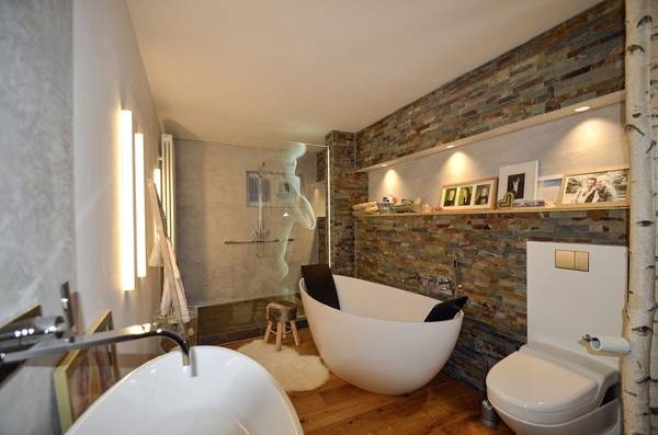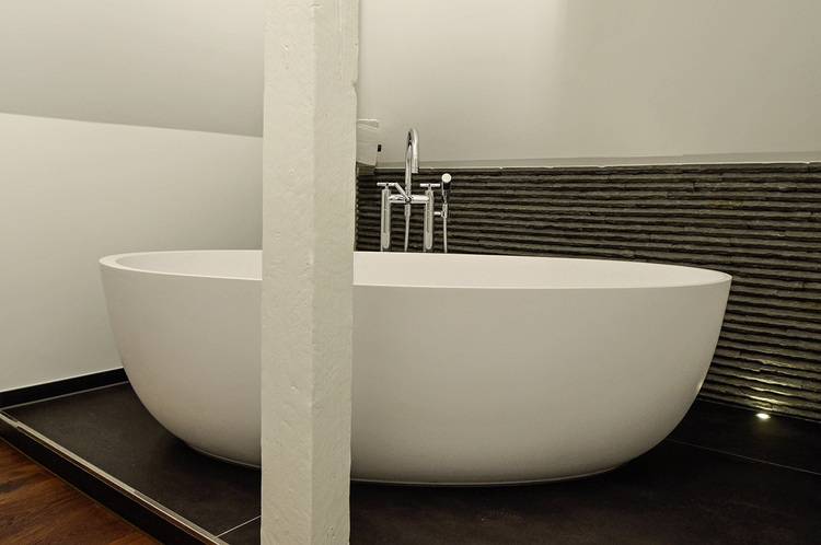 Die mit den Schieferbricks belegte Wand bildet eine passende Bühne für die freistehende Badewanne. Eine organisch geformte Badewanne aus Mineralguss lädt geradezu zum Entspannen ein. Der zierliche Rand und die nach unten hin konisch verlaufende Form lassen das mit 180 x 90 cm doch recht große Element leicht im Raum wirken. Ein Baden alleine oder zu zweit ermöglichen die mobilen Rückenstützen.