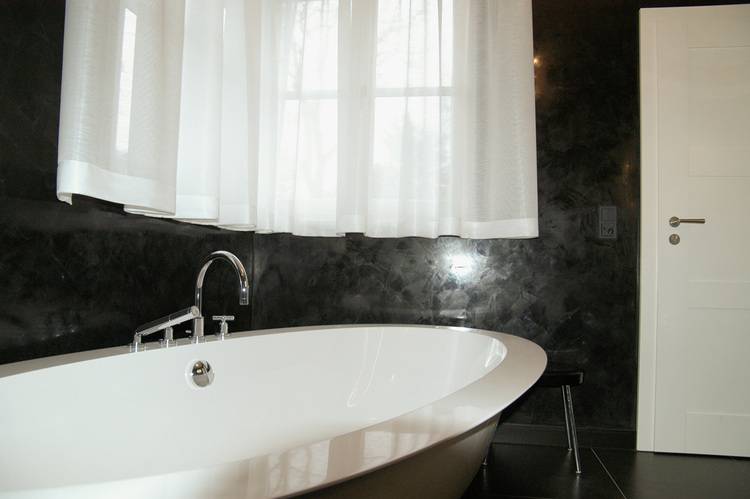 Eine traditionell anmutende Ovalwanne aus Mineralguss soll als Blickfang in einem Bad Wirkung erzeugen, dessen Wände alle schwarz oder anthrazit gefliest und gespachtelt sind. Ein sicherlich sehr dramatischer Auftritt, der etwas an Hollywood erinnert.