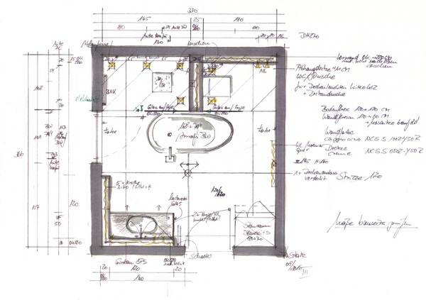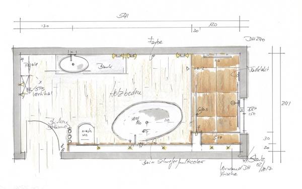 Da die Breite des Raumes es zulässt, wurde zunächst eine freistehende Ovalwanne (aus Corian) eingeplant, die wahlweise in sehr flacher Optik zu bekommen ist und dem Raum optisch damit guttun würde. Dazu muss der Abfluss im Boden versenkt werden, was in dem Fall ja einfach machbar wäre. Leider war es aus statischen Gründen dann doch kritisch. Zu beachten ist das Gewicht der Alternativmaterialien!