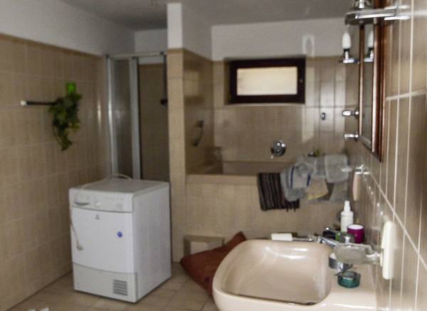 Im Gästetrakt eines Stadthauses steht dieser Bereich zur Verfügung. Eine Dusche lässt sich wegen der Kopffreiheit sicher nicht installieren – so bleibt nur die Wahl der Badewanne. Auch auf die Gefahr hin, dass sich größere Menschen klein machen müssen, um hineinsteigen zu können. Eine kleine Aufstufung wird benötigt, um Zu- und Abläufe zu verstecken. Der Ablauf wird in der Stufe versteckt, so kann die freistehende Badewanne mit dem niedrigen Rand (die dennoch mit 170 x 80 cm einem normal großen Menschen ein schönes Wannenbad gewähren kann) seine Wirkung entfalten.