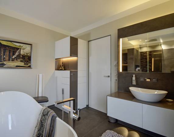 Parallel zur Wanne befindet sich auf der Türseite die Konsolenanlage. Auf ihr thront eine Waschschale, die auch in Form und Material gleich geartet ist. Die Möbelanlage ist mit einem Glas eingefasst, das sich an das Rauchglas in der Farbe anpasst und sich in dem türhohen Schrank in der Raumecke wiederfindet. Hier ist der benötigte Stauraum, der neben dem wandbündigen Spiegelschrank und zahlreichen offenen Nischen gewünscht ist, den Gewohnheiten der Nutzer angepasst.