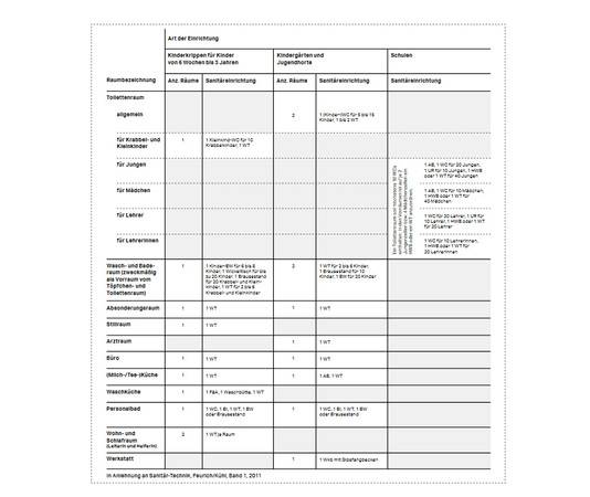 Für den Bau, die Ausstattung und den Betrieb von Schulen gelten in den einzelnen Bundesländern unterschiedliche Verordnungen, Richtlinien und Empfehlungen. Die Richtlinie VDI 6000 Blatt 6 „Ausstattung von und mit Sanitärräumen – Kindergärten, Kindertagesstätten, Schulen“ gibt Architekten und Planern Hinweise, wie die Sanitärräume in Kindergärten, Kindertagesstätten und Schulen ausgestattet sein sollten. Dabei richtet sich der Leitfaden nach den Bedürfnissen von Kindern und Jugendlichen.