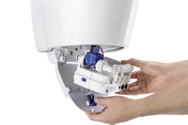 Die Wasserzufuhr muss dank einer automatischen Wasserstopp-Funktion nicht abgesperrt werden, sodass Reihenanlagen während der Wartung eines oder mehrerer Urinale weiter betrieben werden können. Der entscheidende Vorteil: Die Urinalkeramiken müssen dafür nicht extra abgenommen werden. Der Siphon ist von oben gut entnehmbar und ermöglicht einen direkten Zugang zum Entwässerungssystem. Auch der Sprühkopf lässt sich für die Reinigung oder den Austausch einfach abnehmen.