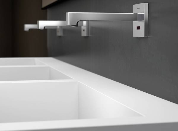 Berührungslos gesteuerte, elektronische Waschtischarmaturen sorgen für zusätzliche Hygiene an den Schulwaschtischen. Vor der Wand zu sehen ist nur der Auslauf und der Infrarot-Sensor – sämtliche Funktionsteile sind in eine separate kleine Funktionsbox integriert.
