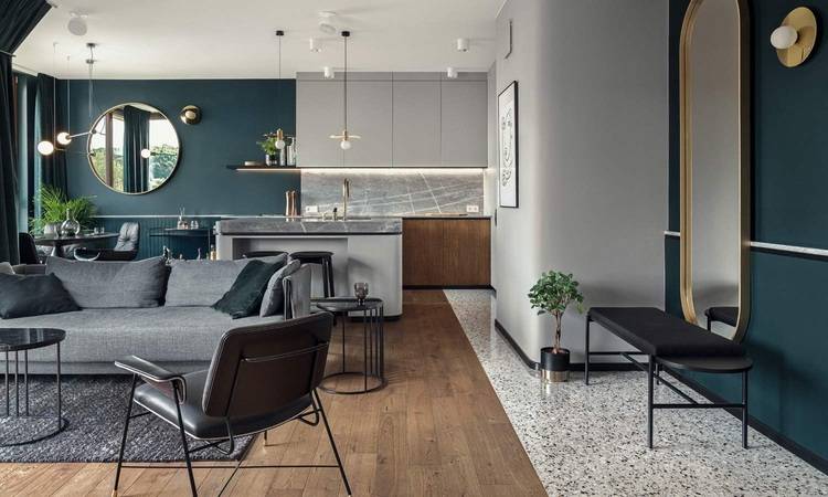 Schließlich untermalt die Farbpalette in gedeckten Nuancen das ruhige Gesamtbild: Warme Grautöne, dunkles Petrol akzentuiert mit Gold und Mattschwarz bilden zusammen mit warmen Holztönen wiederkehrende Designelemente.