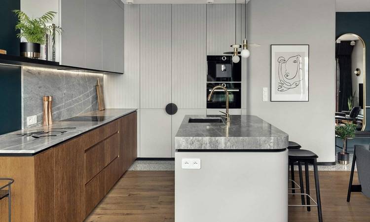 Im Hauptraum befinden sich der Wohn- und Essbereich sowie die Küche als Herzstück der Wohnung. Für die Kochinsel wurde das Küchenmobiliar mit großen warmen Grauflächen versehen, auf dem eine Arbeitsplatte aus edlem Bardiglio-Marmor thront. Goldfarbene Accessoires komplementieren die Küche und wirken durch den farblichen Kontrast wie Schmuckstücke.