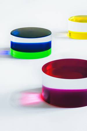 Die eigenständige glatte Oberfläche inspiriert sich an der natürlichen Transparenz von Wasser. Flankiert von klar gezeichneten Wasserhähnen, sind Nice‘s auffällige, transluzente und farbenfrohe Puck-ähnliche Mischer aus jewel-tone Methacrylate hergestellt.