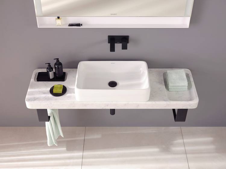Der zweite, und unverzichtbare Teil des Aufsatzwaschbeckens ist der Unterbau, welcher der Designsprache des Beckens folgt – oder gekonnt widerspricht. Wer stimmige Sets bestehend aus Becken und passendem Unterbau bevorzugt, findet im Sortiment von Duravit die ideale Lösung den eigenen Vorlieben entsprechend: Neben passenden Konsolen und Waschtischunterschränken in verschiedensten Oberflächen und Varianten, runden einzigartige Steinkonsolen das Portfolio ab.