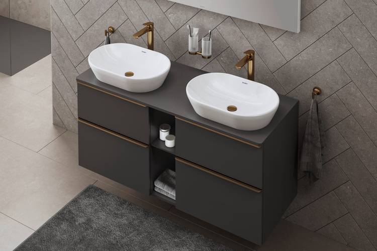 Alternativ umfasst das Duravit-Sortiment Aufsatzbecken, die mit Hahnlochbank und Überlauf ausgestattet sind. Beispielsweise die Aufsatzbecken Happy D.2 Plus mit schmalem, charakteristisch abgeflachtem Rand sind in drei Breiten erhältlich, davon zwei mit eingearbeiteter Hahnlochbank. Markante Eigenständigkeit erhalten sie durch neue Farbvarianten in Anthrazit Matt oder zweifarbig-kontrastierend, innen Weiß glänzend, außen Anthrazit Matt.