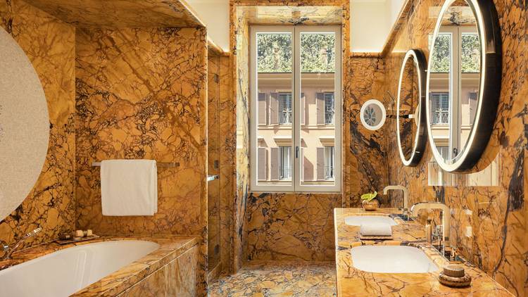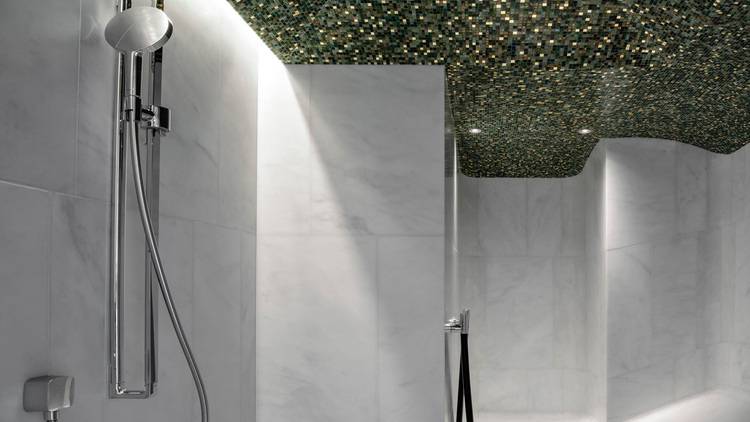 Die Gästebäder wechseln zwischen komplexen Wandteppichen aus kontrastierenden Steinstrukturen, monochromen Marmorflächen - grün aus Brasilien, gelb aus dem Iran, rot aus dem Sudan - und handgelegten Mosaiken, die historische Bulgari-Meisterwerke darstellen. Der Gesamteffekt ist eine Anspielung auf die römische Geschichte, von den Bädern des Caracalla und der Vorliebe des Kaisers Augustus für exotische Materialien bis hin zu den Designtraditionen von Bulgari und dem Rom des 20. Jahrhunderts. Die AXOR Citterio Kollektion in Chrom setzt diese Tradition bis in die Gegenwart fort. Mit ihren Formen, Proportionen und Oberflächen fühlt sich die Kollektion wie zu Hause.