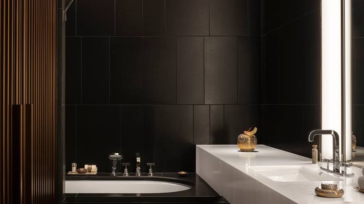 In den Gästebädern schaffen schlichte, kantige Formen und gewellte Oberflächen eine Atmosphäre, die unverkennbar großzügig ist, auch wenn sie von dem japanischen Gebot der Zurückhaltung, Einfachheit und Bequemlichkeit geprägt ist. Eine achromatische Mischung aus italienischem Stein bildet den Hintergrund für warme Hinoki-Holzakzente, dezente Farbtupfer und - natürlich - Armaturen aus der AXOR Citterio Kollektion in Chrom. Mit ihrer neutralen und doch brillanten Oberfläche und den starken, elementaren Formen setzt die Kollektion ein kühnes Statement und fügt sich nahtlos in die Verbindung von japanischem und italienischem Design im Hotel ein.