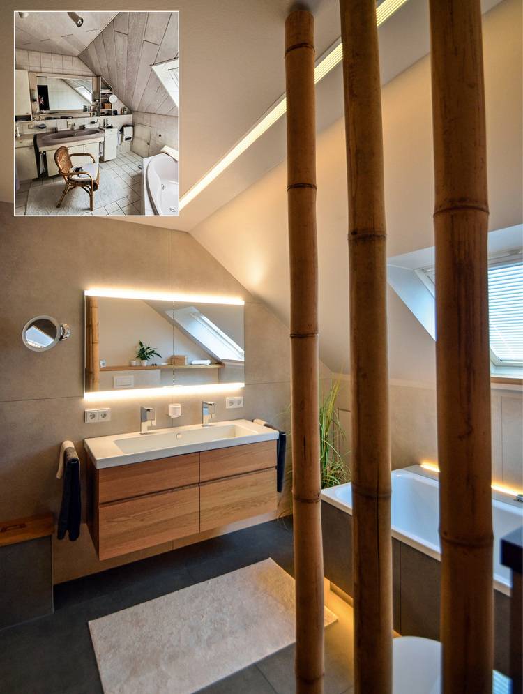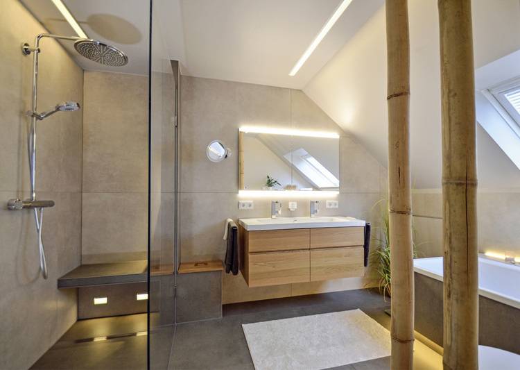Da es sich um ein Bad mit einer Dachschräge handelte, war ein gut ausgefeiltes Konzept notwendig. Das Wohlfühlambiente sollte weiterhin warm und einladend sein, allerdings nicht mit dem Charme der vorhandenen Holzdecke – modernes Ambiente war gefragt. Und auch nicht mit der Farbe Grau.