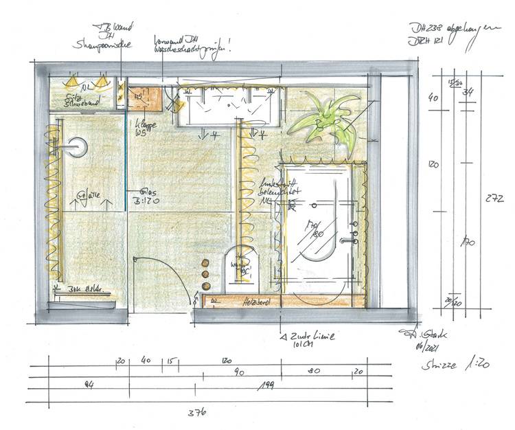Ein Ehepaar möchte das in die Jahre gekommene Bad sanieren und zeitgleich modern gestalten. Natürlich soll auf den Komfort für alle Lebenslagen nicht verzichtet werden, aber eine Badewanne sollte auch weiterhin Bestandteil bleiben. Sie darf zwar kleiner als bisher ausfallen, aber das Ritual des Badens für ein oder zwei Personen (oder die Enkelkinder) hat einen festen Platz im Leben der Nutzer. Zudem soll die Dusche möglichst groß und bodeneben gestaltet werden, ein WC und auch zwei Waschplätze sind ebenfalls gewünscht, wie schon im alten Bad.
