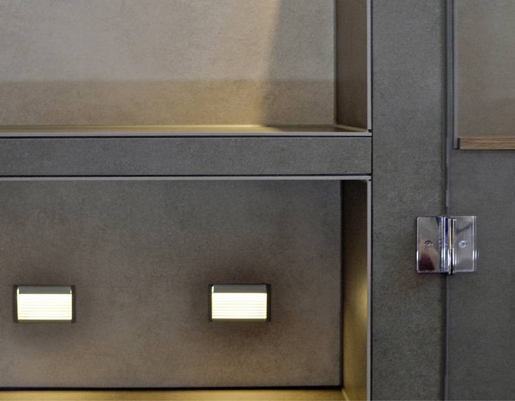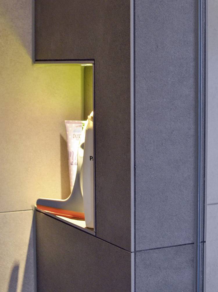 Die Duschzone darf sich über die gesamte linke Raumseite erstrecken. Sie wird in der Breite durch den angrenzenden Wäscheabwurf begrenzt, der sich derzeit im Unterschrank links neben dem Waschtisch befindet. Allerdings wird sie luftiger gestaltet, indem die feste Seitenwand in der Tiefe reduziert und zurückgebaut wird. Eine 40 cm tiefe, frei schwebende Sitzbank gibt nun das Maß vor – der Wäscheabwurf wird mit einer Klappe versehen und dient auf gleicher Höhe nun als kleiner Sitz oder auch als Abstellmöglichkeit für die Füße beim Eincremen. Die anlagenbreite Duschrinne ist reinigungsfreundlich vor dem Sitz platziert, zwei Einbauleuchten sind in der Wand verbaut. Da die Zwischenwand und die Sitzebene mit den Bodenfliesen belegt sind, weist das Licht den Weg – die Sitzbank ist in allen Situationen als Sitzebene erkennbar.