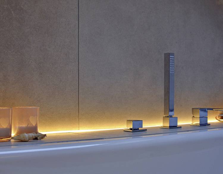 Da sie teilweise freisteht, wird ein Lichtband auf den beiden freien Seiten geführt. Neben der Badewanne befindet sich eine Öffnung in den Drempel (Kniestock), der nicht verbaut werden sollte, sonst wäre hier ein schöner Ablagebereich möglich gewesen. So aber illuminiert ein LED-Profil über Eck den Bereich, lässt optisch die Badewanne schweben und erfüllt zusätzlich die Funktion des Nachtlichtes.