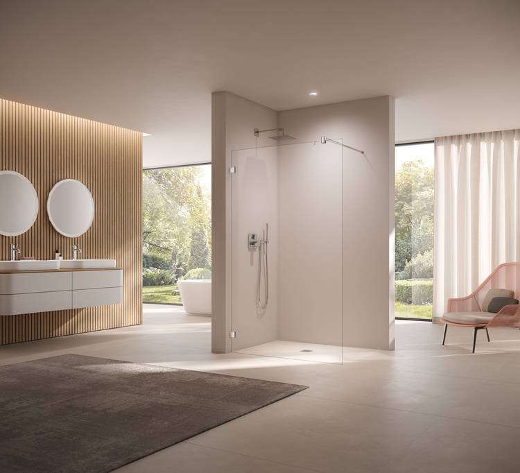 Die Integration in die bestehende Bausubstanz ist auch Leitgedanke bei vielen modernen Duschabtrennungen. Bei einer komplett rahmenlosen Konstruktion kommen die hochwertigen Metallbeschläge der Beschlag-Duschkabine Mena von Kermi besonders gut zur Geltung. Aber auch dank des dezenten Wandprofils wirkt die Dusche sehr transparent. Alle Türen verfügen über einen nach innen und außen öffnenden Pendeltür-Komfort mit Hebe-Senk-Funktion und einen ungehinderten, bodenebenen Einstieg in die Duschkabine.