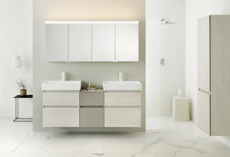 Mit den im klassischen Rastersystem scheinbar nahtlos aneinander zu reihenden Waschtischen und Anbauschränken lassen sich breite bodenstehende Schrankzeilen mit Einbauküchen-Charakter bilden. Unterstützt wird dieser Eindruck durch die betont horizontale Linienführung des grifflosen Möbeldesigns, wodurch sich bei einer Aneinanderreihung der Module auch optisch eine Analogie zum Küchendesign ergibt.