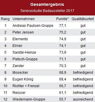 - Als Testsieger geht die Andreas Paulsen-Gruppe mit dem Qualitätsurteil "gut" aus der Servicestudie hervor. Fragen zur Badgestaltung werden fachkundig, korrekt und meist vollständig beantwortet. Die Mitarbeiter sind ausgesprochen kommunikationsstark, reagieren auf Beschwerden stets mit einer Entschuldigung und nehmen die Kundenanliegen ernst. Die Mitarbeiter treten zudem sehr motiviert auf und nehmen sich ausreichend Zeit für die Beratungen. Das vielfältige Angebot sowie die umfangreichsten Zusatzservices, wie die kostenlose Liefermöglichkeit, fallen ebenfalls positiv ins Gewicht.