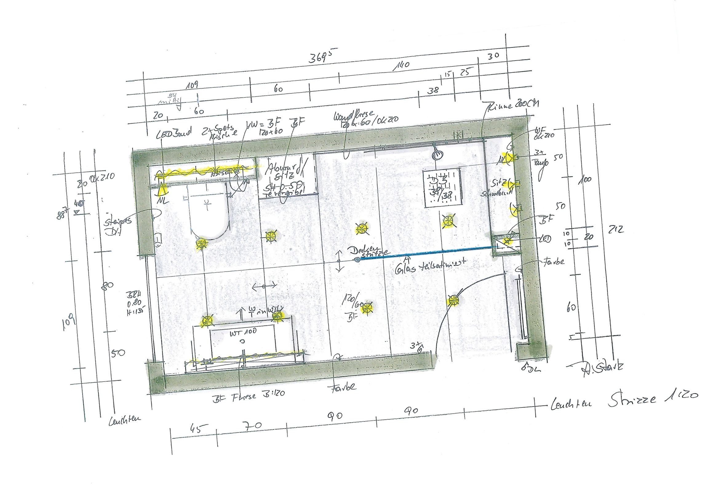 Da die Duschzone als großes Element nicht vor dem Fenster an der Kopfseite des Raumes positioniert werden soll, muss die Farbgestaltung im Raum dafür sorgen, dass die Längsstreckung aufgehoben wird, um eine harmonische, quadratische Wirkung zu erzeugen. Die Position des Wäscheabwurfes sollte beibehalten werden, da er durch die Betondecke hindurch direkt in den Waschkeller mündet.