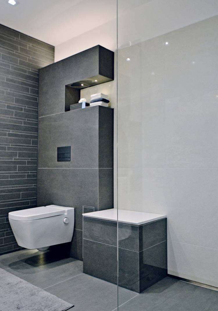 Hier spiegelt sich die seitlich offene Nische, die mit LED-Spots beleuchtet ist und für Dekorationsgegenstände zur Verfügung steht. Auch hier läuft die helle Wandfliese in die Nische im Fugenschnitt hinein; der gesamte WC-Bereich steht durch die Verfliesung mit den dunklen Bodenfliesen im Vordergrund. Der Papierhalter hängt praktisch im rechten Winkel zur Toilette, die WC-Bürste verschwindet unsichtbar hinter einer verfliesten Klappe.