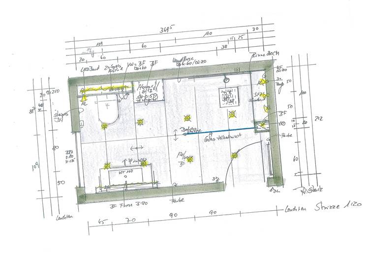 Ein Bauherrenpaar möchte das funktionale und immer noch ansprechende Badezimmer, das im Erdgeschoss gegenüber dem Schlafzimmer liegt, renovieren. Die Dusche ist bereits bodenbündig gestaltet, aber mit 90 cm im Quadrat nicht sonderlich großzügig. Gestaltung und Farbgebung erinnern an die 1980er-Jahre und passen somit nicht mehr zu dem Einfamilienhaus im Bergischen Land, in dem in den letzten Jahren fast alle Bereiche dem aktuellen Anspruch der Bauherren angepasst wurden.