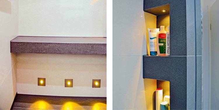 Die Wärme im Raum, Lebendigkeit und immer wieder neu einstellbare Farbnuancen werden durch die aufwendige Lichttechnik erreicht. Neben dem Funktionslicht am Spiegelschrank leuchten die kleinen LED-Spots in den Nischen und die indirekte LED-Beleuchtung über dem WC-Modul als Effektlicht zeitgleich auf. Eine kleine LED-Leuchte neben dem WC und drei Spots unter der Sitzbank werden über einen Bewegungsmelder gesteuert, leuchten beim Betreten des Raumes den Boden automatisch aus und weisen den Weg beim nächtlichen Badbesuch.