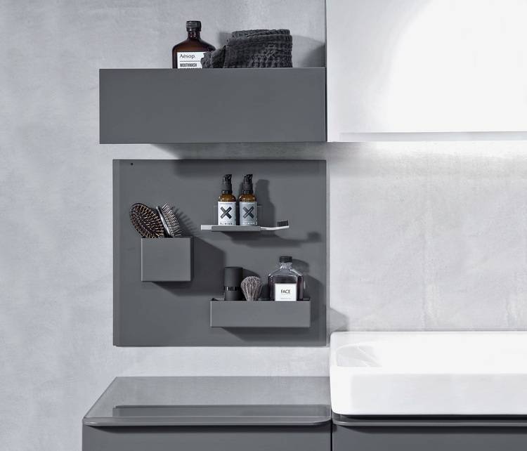 Wer zusätzlich zu Waschtischunterschrank, Seitenschrank oder Hochschrank Ablageflächen benötigt, der kann an geeigneten Stellen im Bad auch Wandablagen anbringen. Innerhalb der Geberit-Badmöbelserien etwa variieren die Ausführungen von flachen Ablagen in unterschiedlichen Größen bis hin zu raffinierten Lösungen wie flexibel an Magnettafeln anzubringenden Ablagekörben.