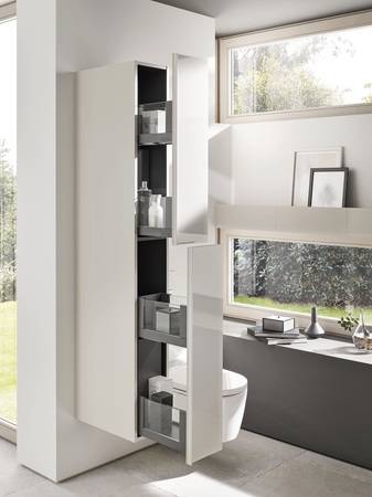 In geräumigen Bädern können Möbel auch eine raumstrukturierende Funktion einnehmen – und etwa das WC vom restlichen Raum abtrennen. Möglich ist das beispielsweise durch Schrankelemente mit Apothekerauszug. Sie ragen bewusst tiefer in den Raum hinein, sind dafür jedoch weniger breit. Durch den Möbelauszug nach vorne kommen Nutzer bequem an alle Dinge des persönlichen Bedarfs. Diese Sonderform der Hochschränke findet sich beispielsweise in der Badserie Geberit Acanto.