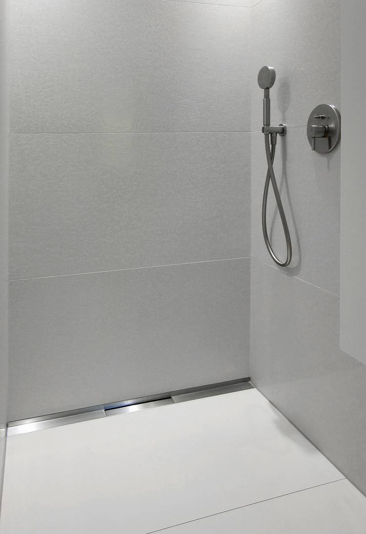 Für mehr Komfort wurde der neue Estrich mit einer Warmwasser-Fußbodenheizung versehen. Gleichzeitig eröffnete der neue Aufbau die Möglichkeit, eine bodengleich geflieste Dusche mit Duschrinne zu realisieren. Das gewählte Modell ist durch seine Position direkt an der Wand und über die ganze Breite der Dusche unauffällig. Das kommt dem Wunsch der Kundin nach einer minimalistischen Gestaltung entgegen. Diagonalschnitte waren nicht nötig, denn das Gefälle ist innerhalb der Rinne angelegt. So kommen großformatige Fliesen wunderbar zur Geltung.