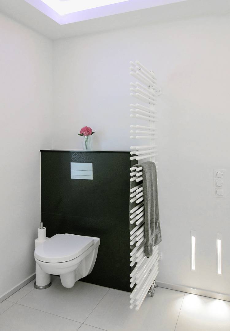 Da der alte Heizkörper nicht mehr gebraucht wurde, dient die Heizkörpernische unter dem Fenster nun – ebenfalls ausgestattet mit Glasböden – als Regal für Handtücher. Das WC wird durch einen quer im Raum stehenden Handtuchheizkörper gegen Blicke von der Tür aus abgeschirmt. Auf ein zusätzliches Bidet wurde verzichtet, später soll ein Dusch-WC installiert werden. Leider war das Modell, das sich die Kundin ausgesucht hatte, zum Zeitpunkt der Ausführung noch nicht lieferbar. Das entsprechende Unterputzelement – mit Strom- und Wasseranschluss – wurde bereits vorgerichtet.