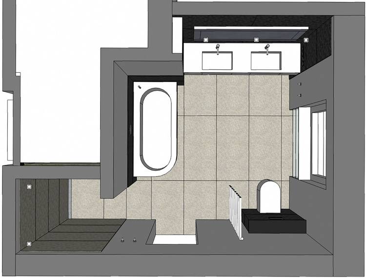 Das Zusammenspiel von kreisrunden und eckigen Formen bestimmt die Gestaltung: Die Einbauspots in der Decke sind quadratisch genau wie die Kopfbrause in der Dusche. Rechteckig sind die Einbaubecken, der Spiegel und die Betätigungsplatte am WC. Die rechteckige Wanne mit ihrer abgerundeten Ecke vereint beide Formen. Sie hat aber auch ganz praktische Gründe, denn ein rechteckiges Modell hätte hier zu weit im Laufweg gestanden.