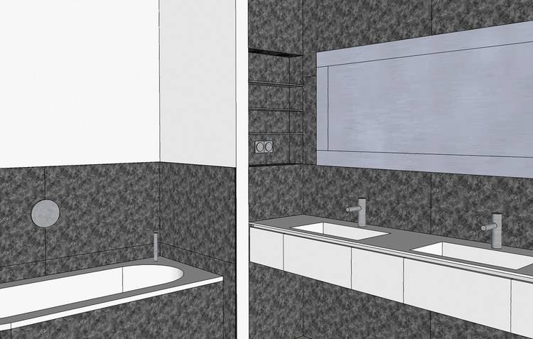 Weitere Steckdosen sind an der rechten Seitenwand – mit integriertem Radio – und links in einer Nische installiert. Diese ist mit Glasböden bestückt und wird von zwei Spots beleuchtet. Hier sind die täglich genutzten Toilettenartikel im direkten Zugriff. Die Nischenhöhe ist abgestimmt auf den großen Spiegel über den Waschtischen. Sein indirektes Licht bringt die Struktur der Wandfliesen zur Geltung.