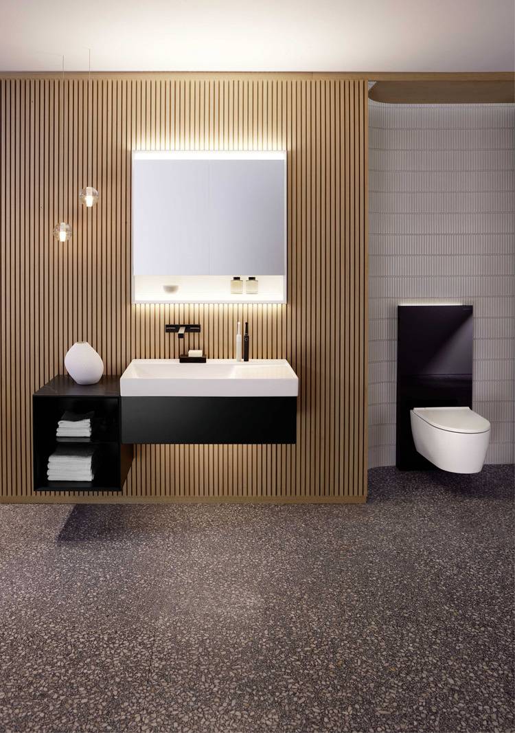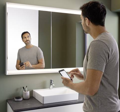 Unterschiedliche Lichtquellen, -farben und -intensitäten verleihen dem Bad zusätzliche optische Dimensionen und Stimmungen. Lichtplaner erarbeiten für einzelne Räume ganz individuelle Beleuchtungskonzepte. Doch auch Badplaner und Installateure können mit Basiswissen und der Auswahl geeigneter Ausstattungen ihren Kunden überzeugende Beleuchtungslösungen für Badezimmer und Toilette bieten. So lässt sich beispielsweise der Geberit-One-Spiegelschrank mit dem Monolith-Plus-Sanitärmodul synchronisieren, die Unterbauleuchte und der LED-Einbaustrahler sind ebenfalls kombinierbar. In dieser Zusammenstellung bietet der Spiegelschrank bereits zahlreiche Lichtszenarien.