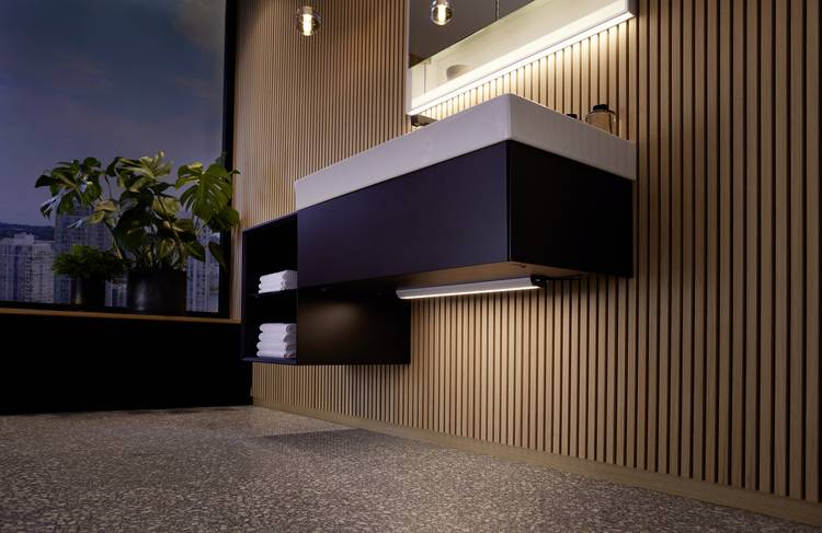 Mit einem einzigen Einrichtungsgegenstand können Installateure ihren Kunden damit bereits individuelle Lichtszenarien bieten. Diese lassen sich in einem weiteren Schritt mit dem Sanitärmodul Monolith Plus in den Raum hinein erweitern. Der Hersteller hat die Beleuchtung des Moduls an das Lichtkonzept angepasst. Das Modul lässt sich mit den Spiegelschränken der Badezimmerserie Geberit One bzw. deren Lichtstimmung synchronisieren. Die Unterbauleuchte und der LED-Einbaustrahler lassen sich ebenfalls in ComfortLight einbinden. Eine integrierte DALI-Schnittstelle sorgt dafür, dass sich das Licht zentral einstellen und steuern lässt. Die einmal am Spiegelschrank vorgenommene Lichteinstellung gilt somit auch für das Orientierungslicht des Sanitärmoduls.