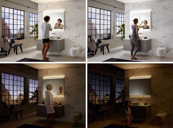 Das Lichtkonzept des Spiegelschranks zeichnet sich durch vier vorprogrammierte Lichtstimmungen aus, die je nach Tagesrhythmus das richtige Licht bieten: von der hellen Beleuchtung am Morgen über das Standardlicht bis hin zur Kerzenlicht-Atmosphäre und dem Orientierungslicht für die Nacht. Vier in den Spiegelschrank integrierte, aufeinander abgestimmte Lichtquellen ermöglichen eine individuell steuerbare Beleuchtung. Die Lichtsteuerung ist stufenlos dimmbar – von hellem, kühlerem Licht bis hin zu dunklerem, wärmerem Licht. Diese Kopplung von Farbtemperatur und Beleuchtungsstärke ist eine Besonderheit.